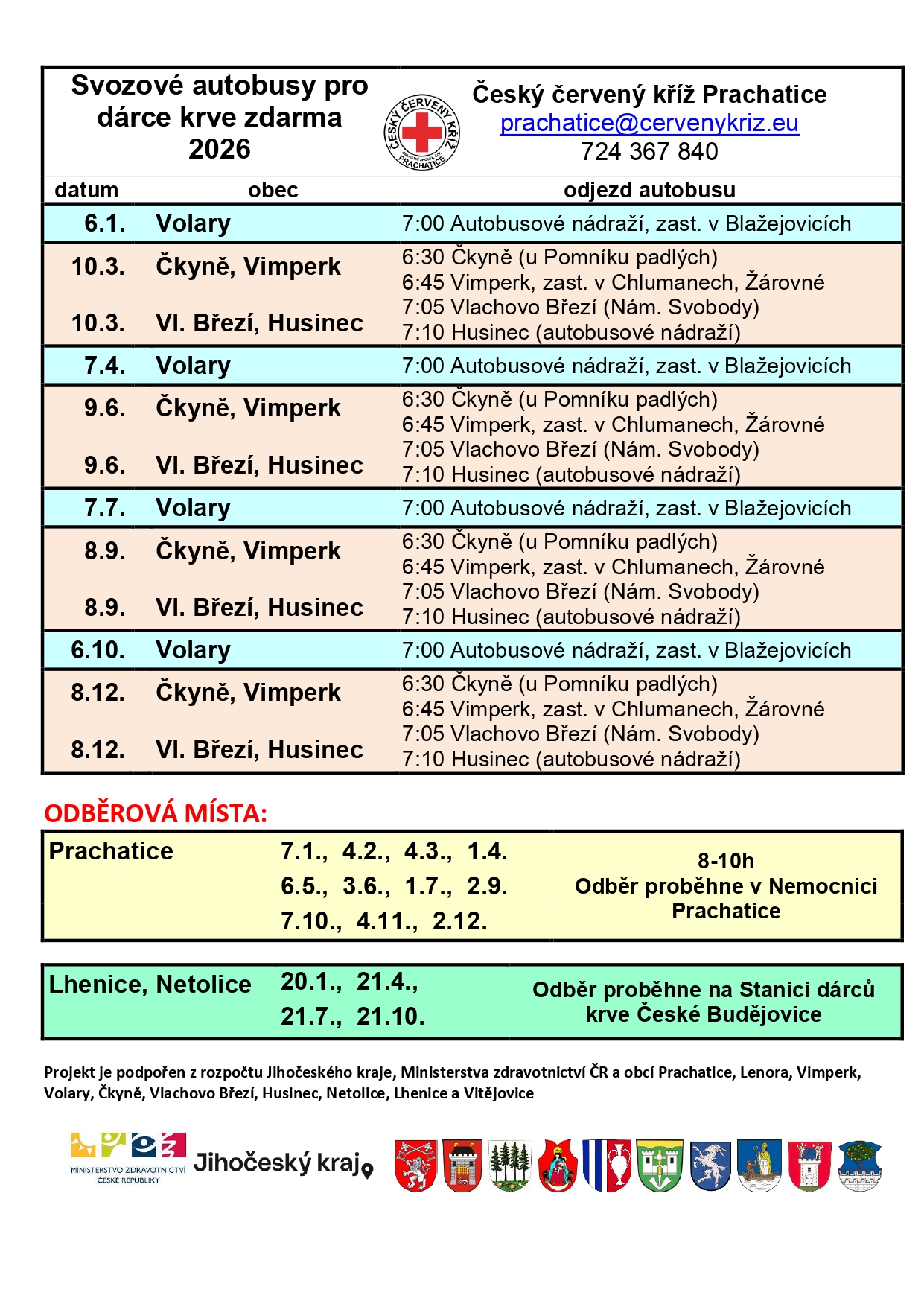 Netolice, Němčice - Při všech ostatních termínech jedeme přes Netolice/Němčice a je možné po domluvě zde zastavit. Je možné se po domluvě na transfuzním oddělení přeregistrovat do obvodu "Volary" nebo "Vimperk" a budou Vám chodit pozvánky na jejich termíny.